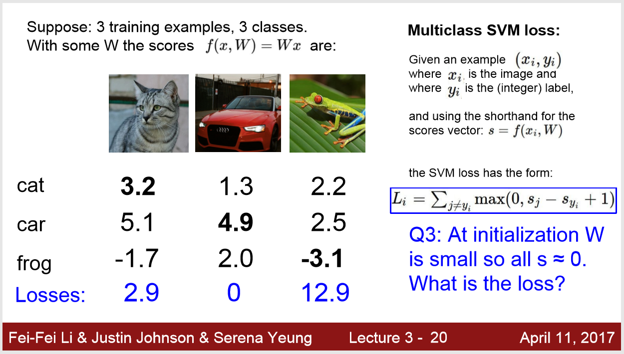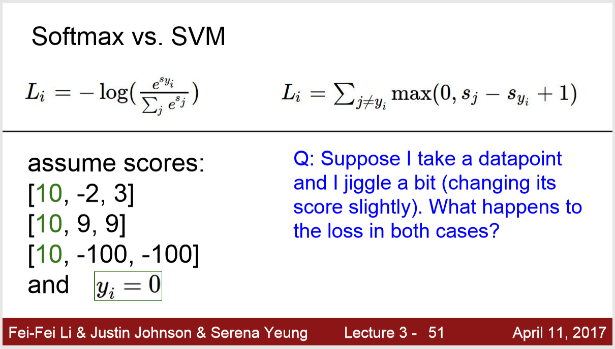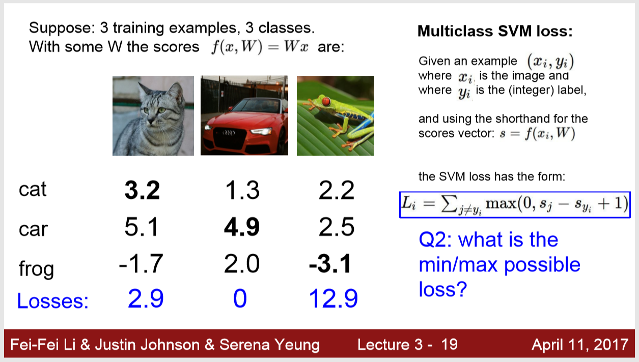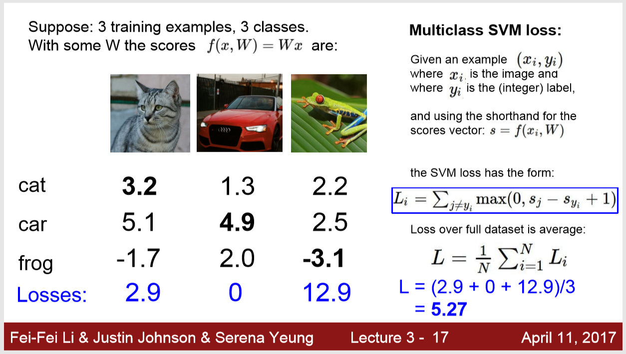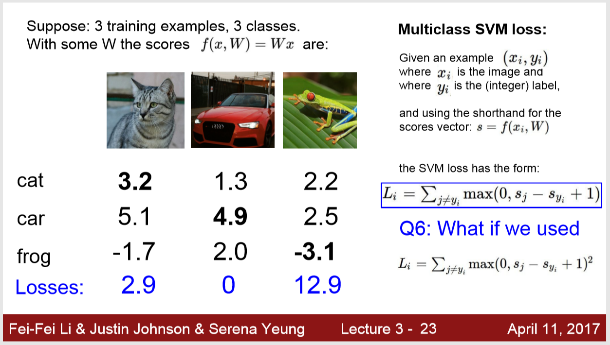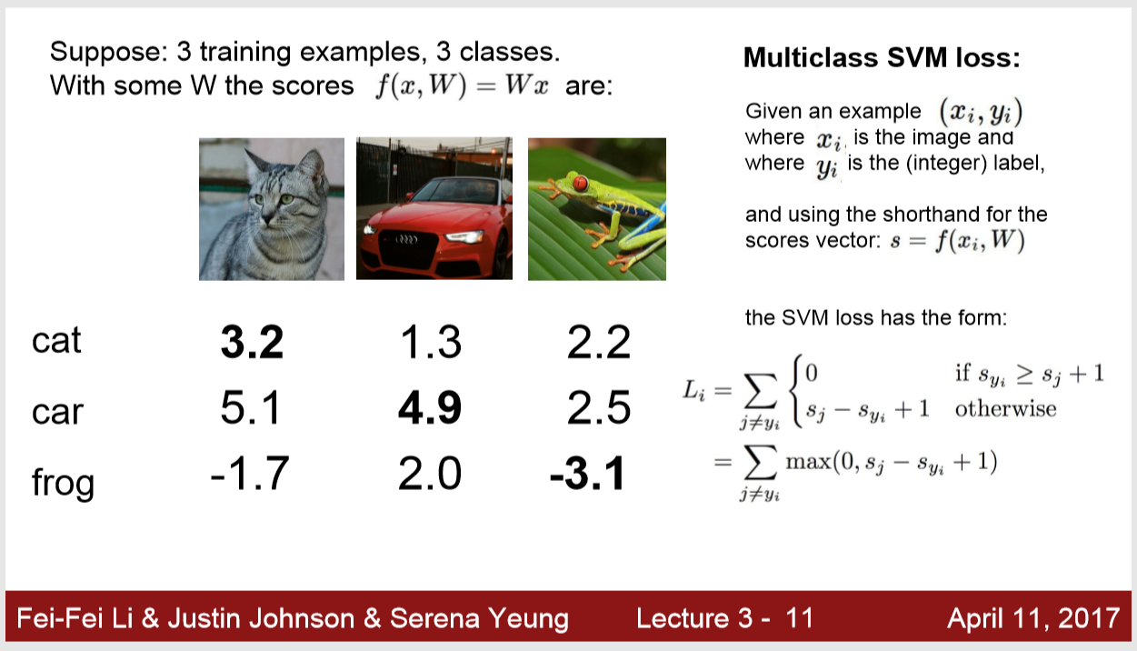 이렇게 score가 나오면 svm hinge loss 와 cross-entropy loss ( softmax ) 의 차이점을 볼 수 있습니다.