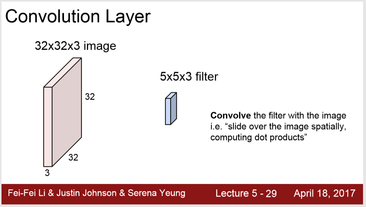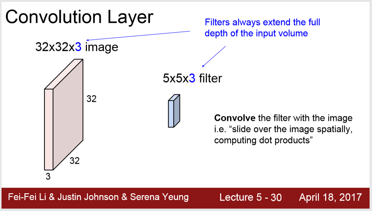 filter는 5 x 5 x 3의 모양이며 여기서 depth가 3이기 때문에 이 filter 도 3의 모양을 갖고 있는 것입니다.