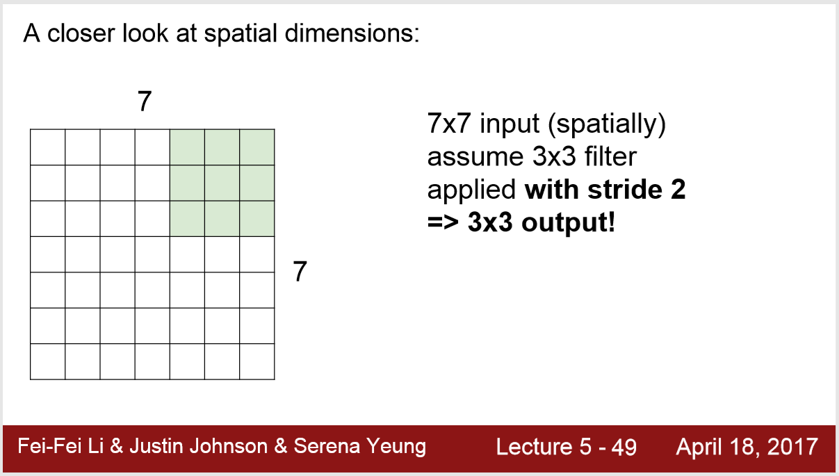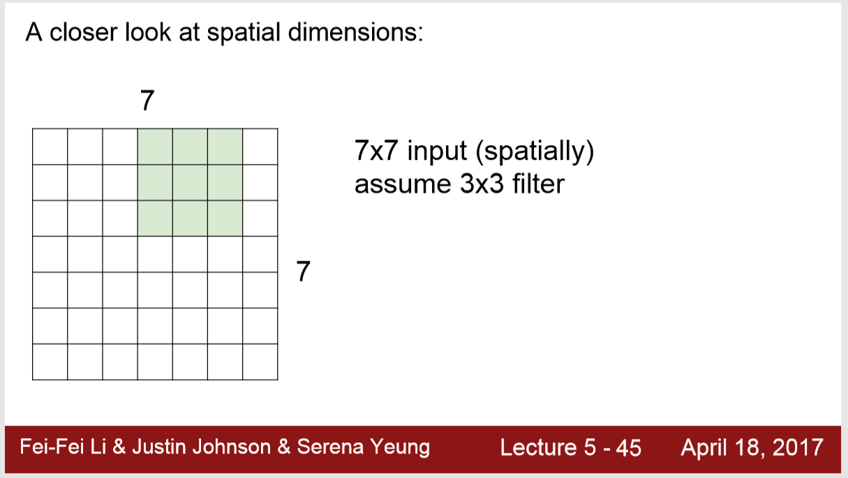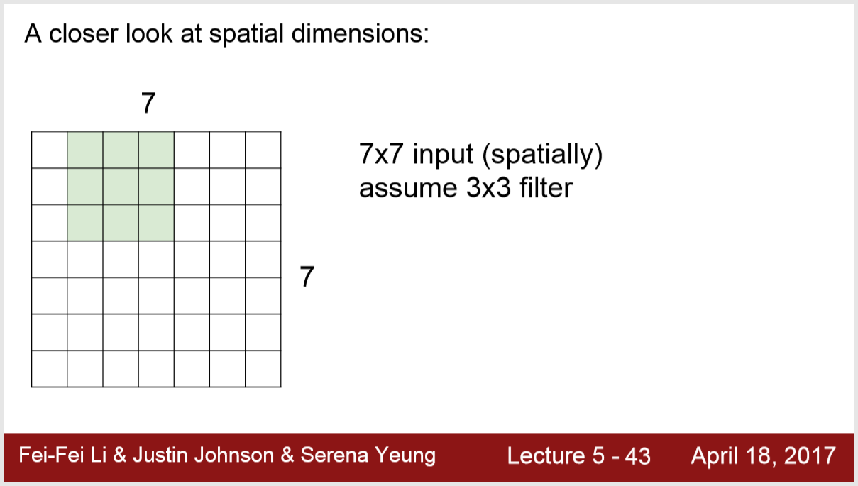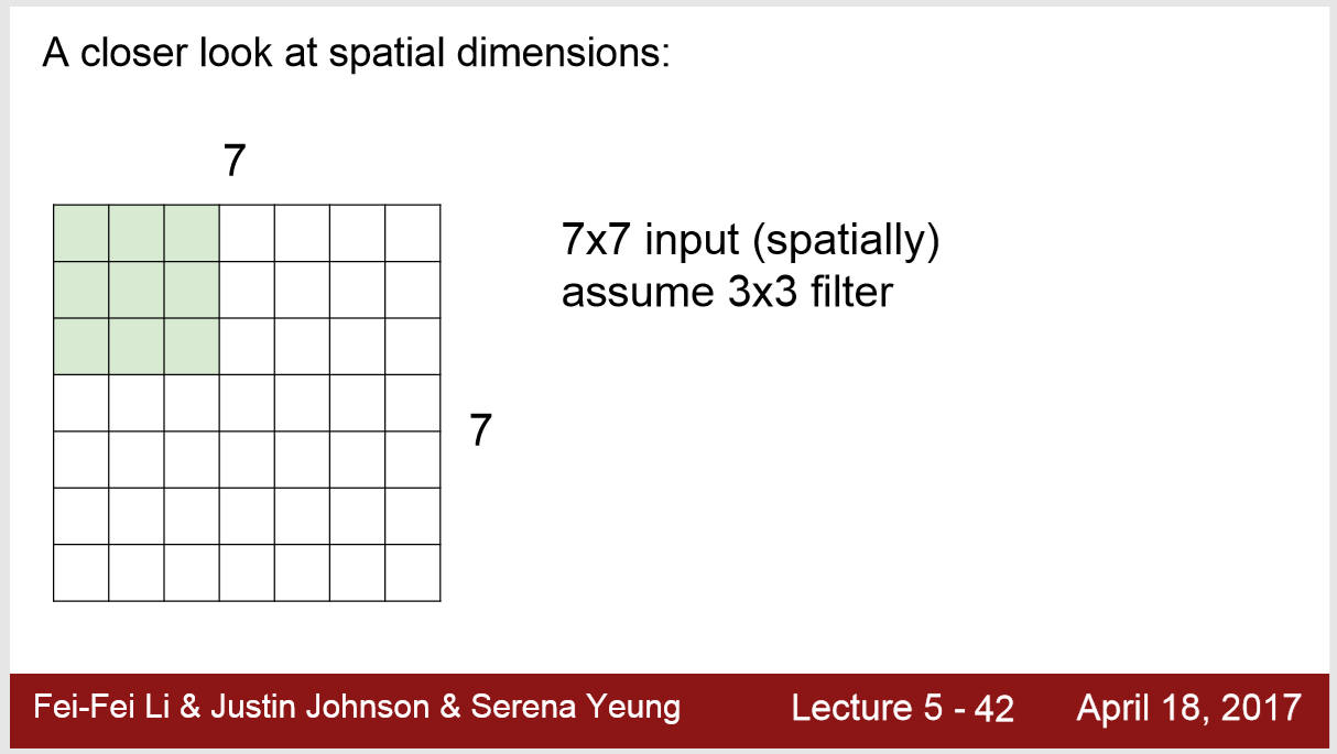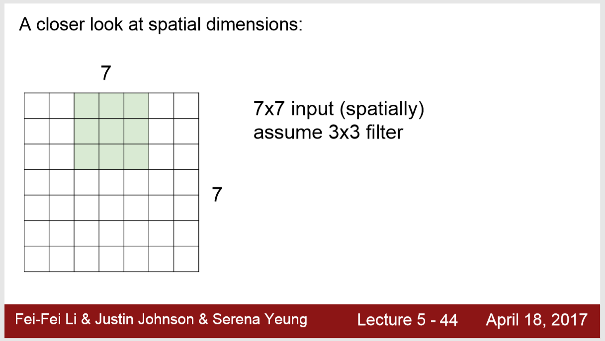 위 그림처럼 7 x 7 에서 3 x 3 filter가 움직일 수 있는 거리는 5번 입니다.