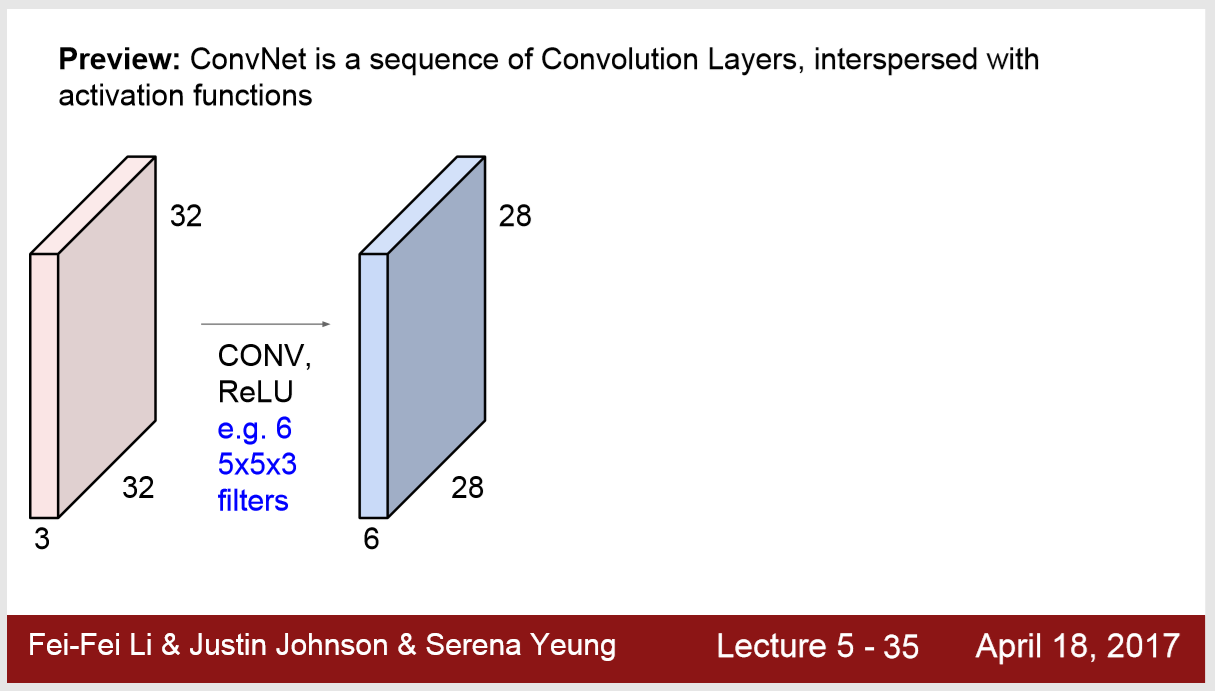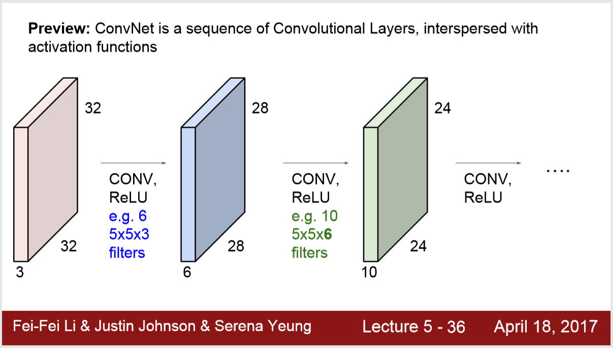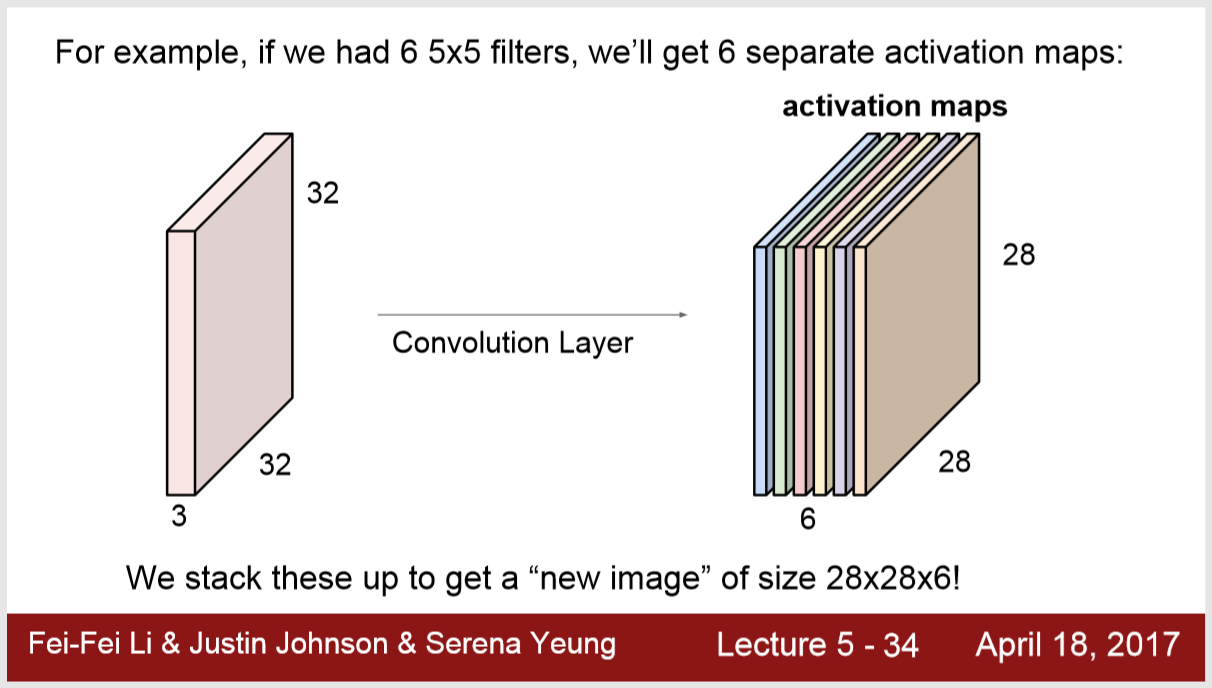위 그림처럼 6개의 필터를 사용하게 된다면 6개의 activation maps가 나오게 되는 것입니다.