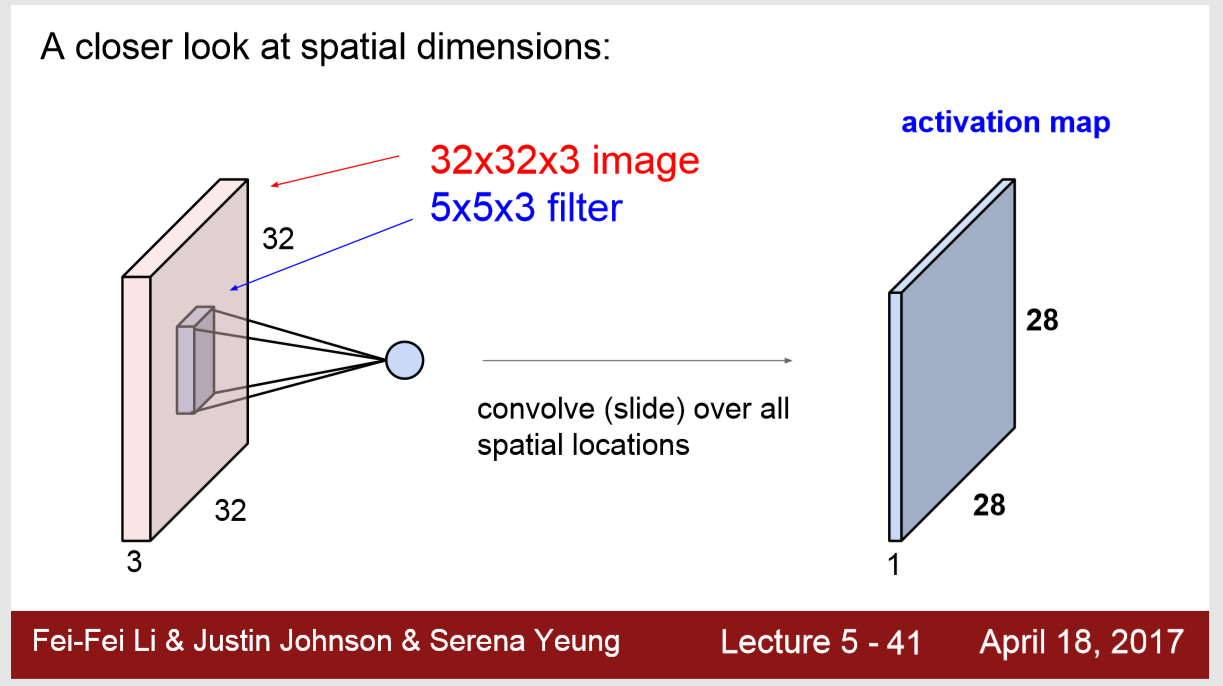 위 그림은 32 x 32 x 3 input 이미지에 5 x 5 x 3 convolve filter를 거치게 되면