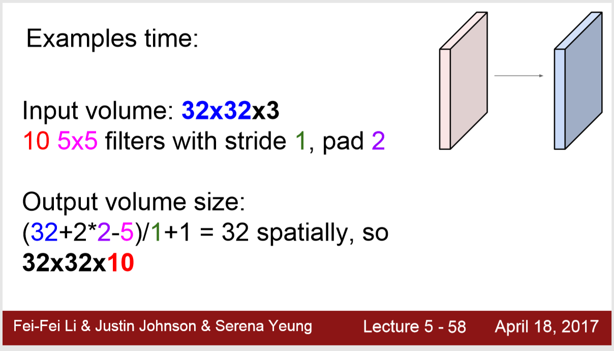 아까 앞에서 살펴본 32 x 32 에서 5 x 5 필터를 이용하면 28 x 28이 나왔던 이유가 이것 때문입니다.