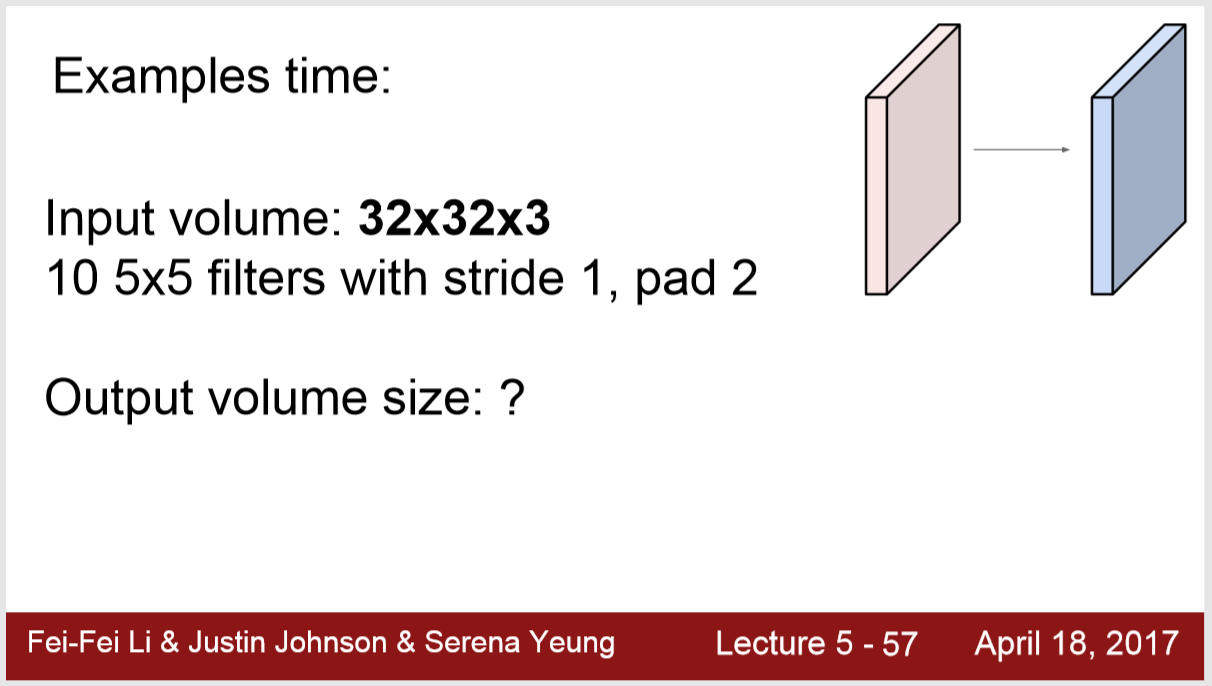 32 x 32 x 3 의 input에 5 x 5 filter 10개와 stride 1 , pad가 2이면 어떻게 될까요 ??