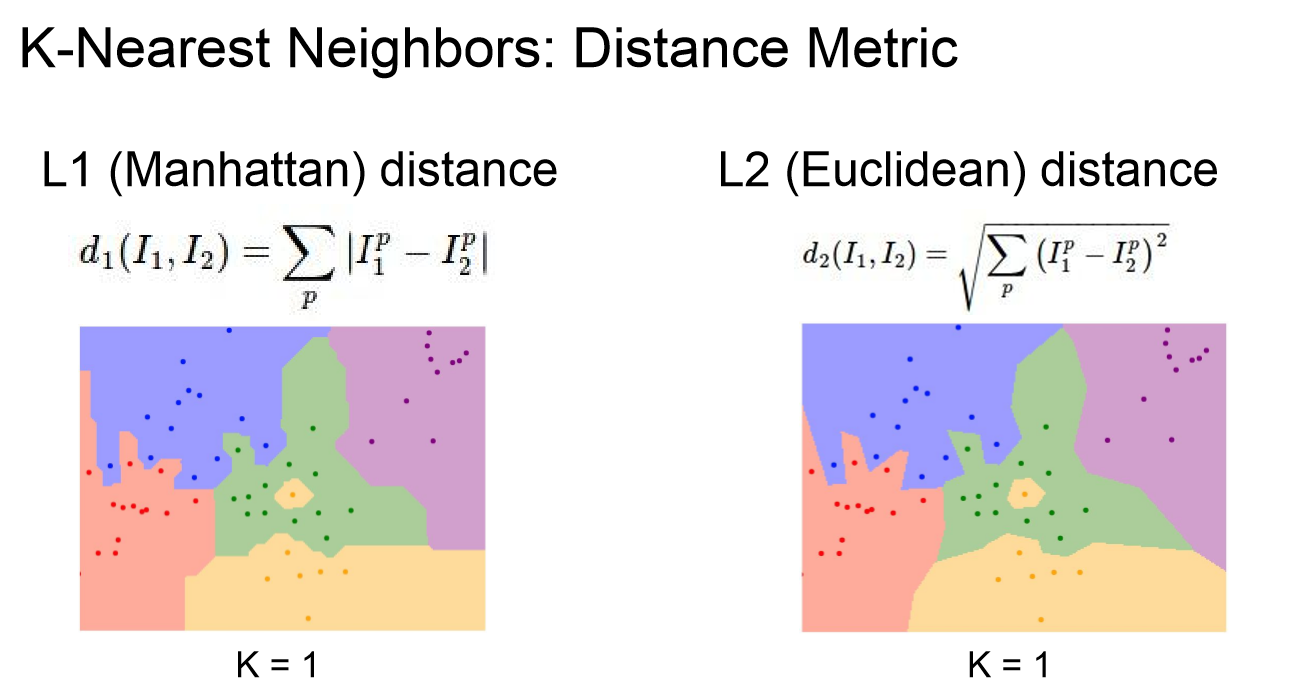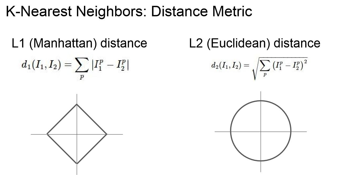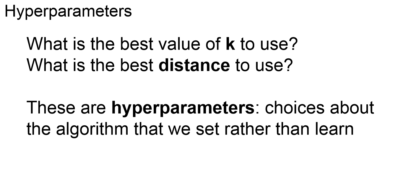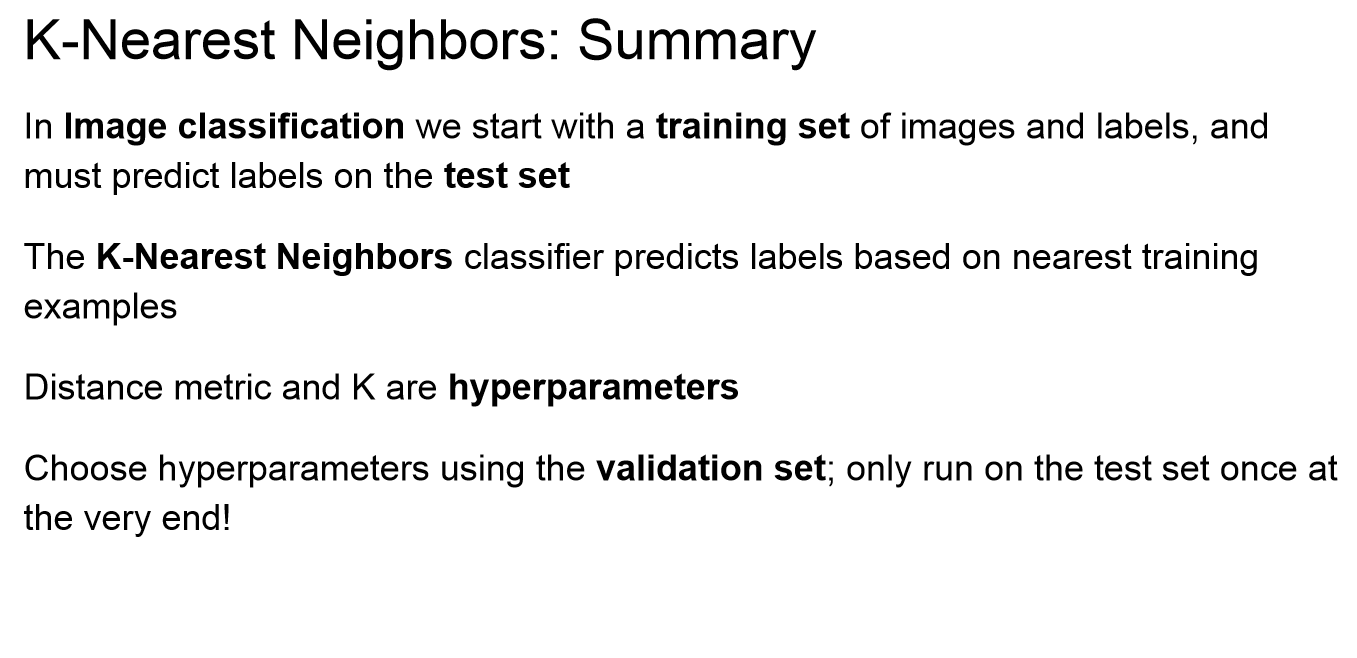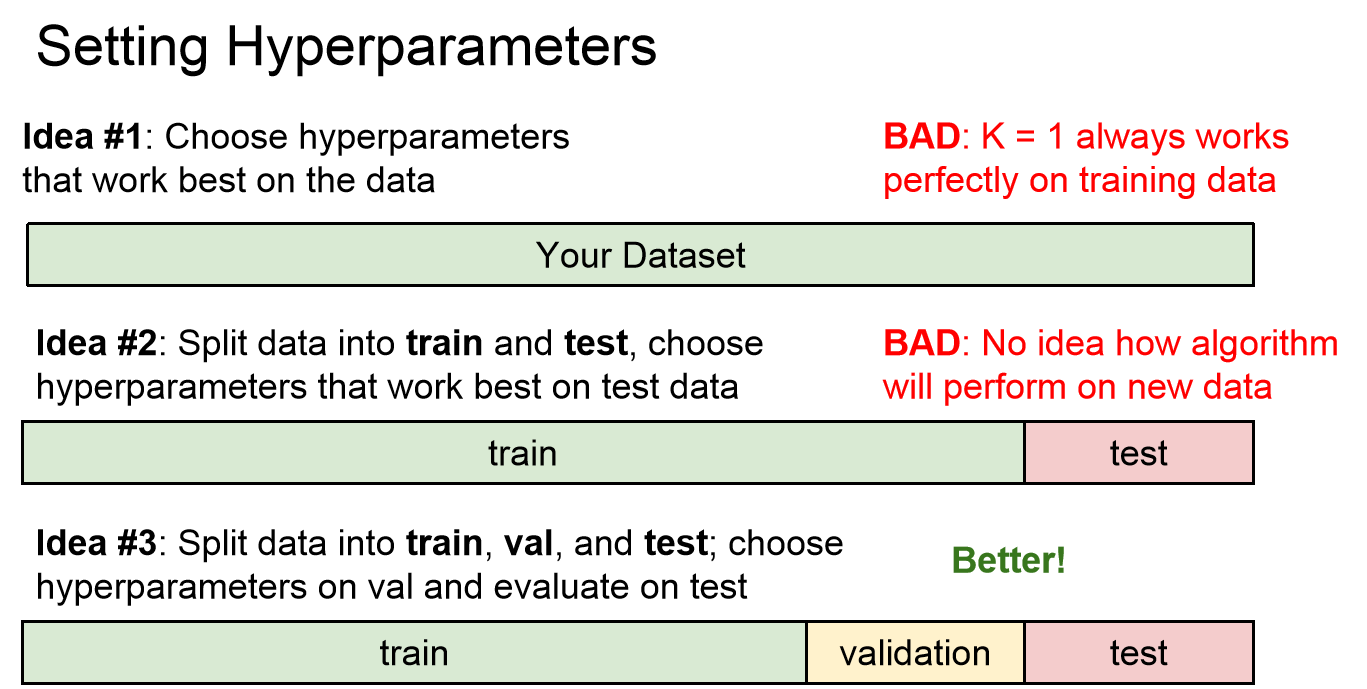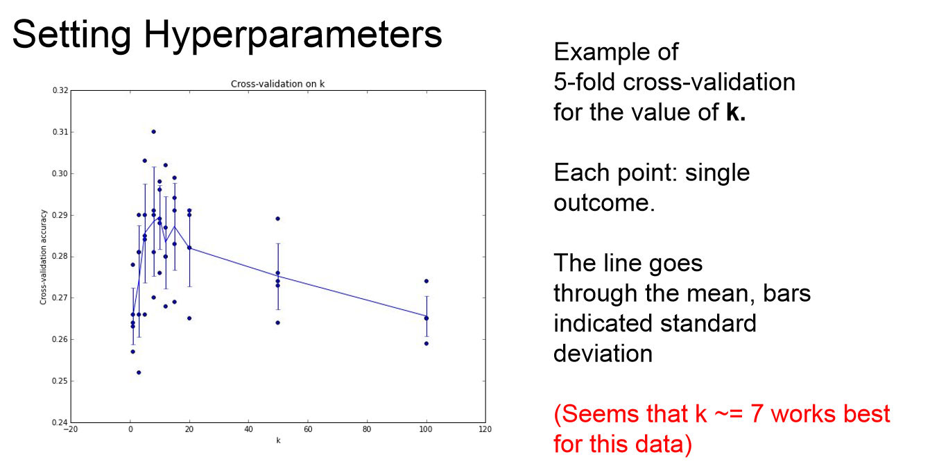 L1 distance , L2 distance , k 값은 hyperparameter 라는 것도 알았으며 hyperparameter의 값을 고를 때에는