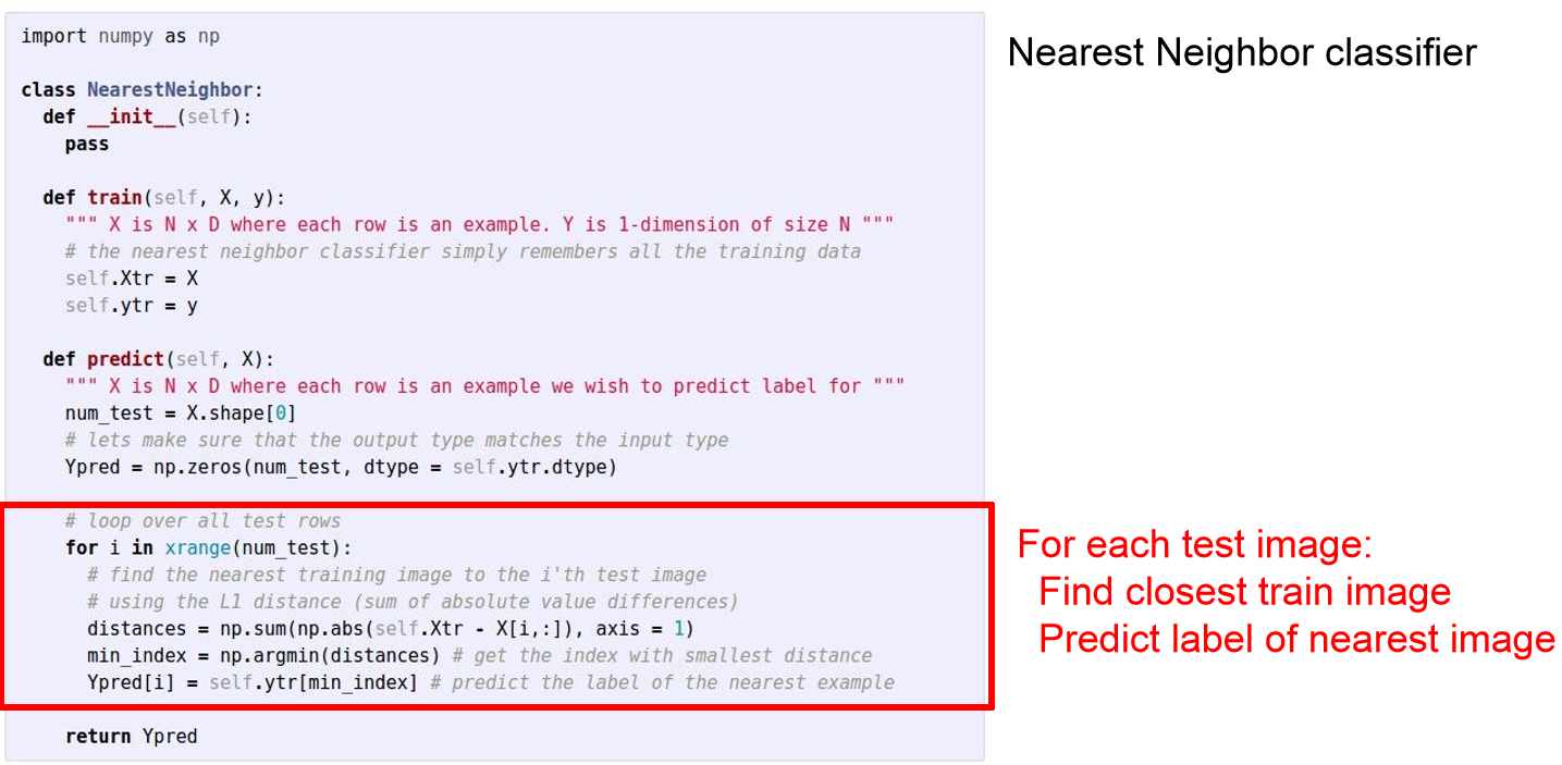 라고 생각하는 과정이 바로 이 부분이 Nearest Neighbor classifier 에서 predict 예측하는 부분입니다.