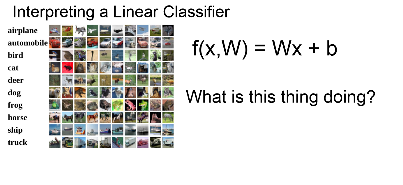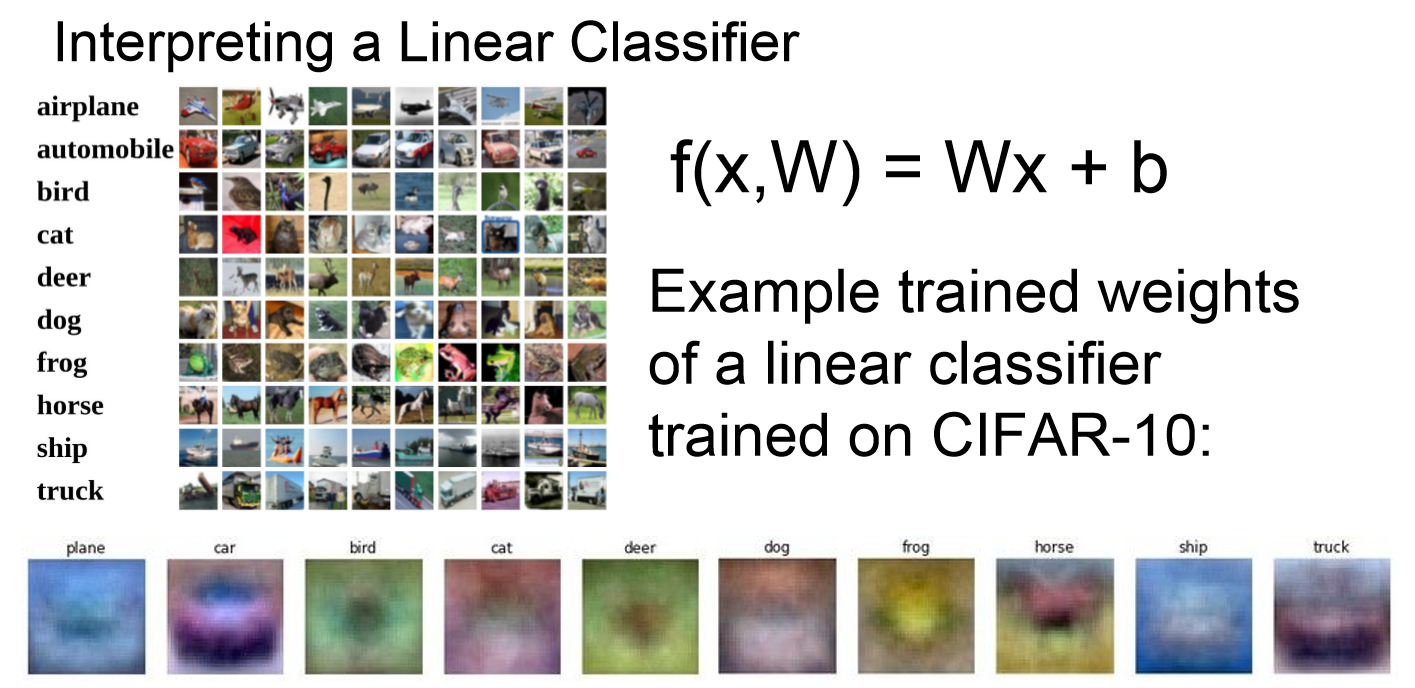 위 그림은 CIFAR10 데이터셋에 존재하는 각각의 카테고리들로 훈련된 weight값을 사진으로 표현한 것입니다.