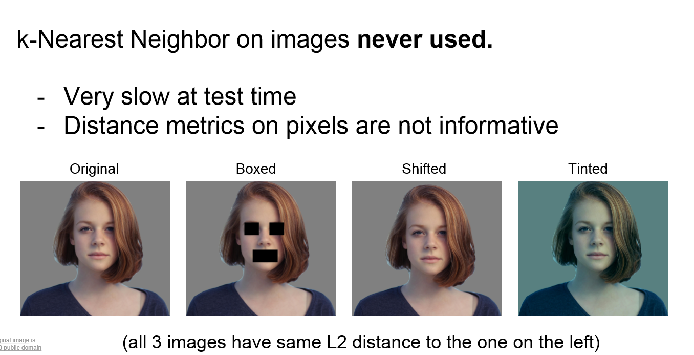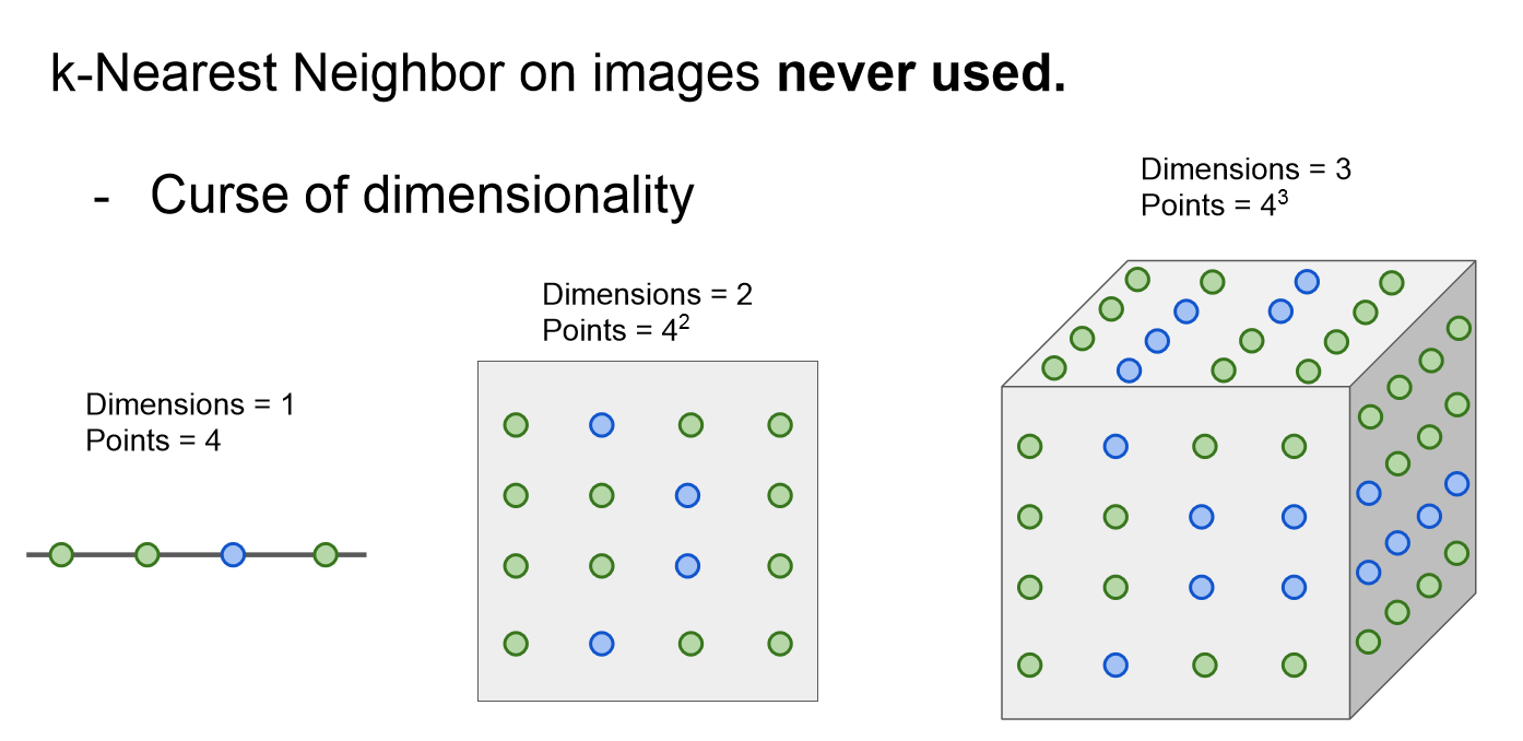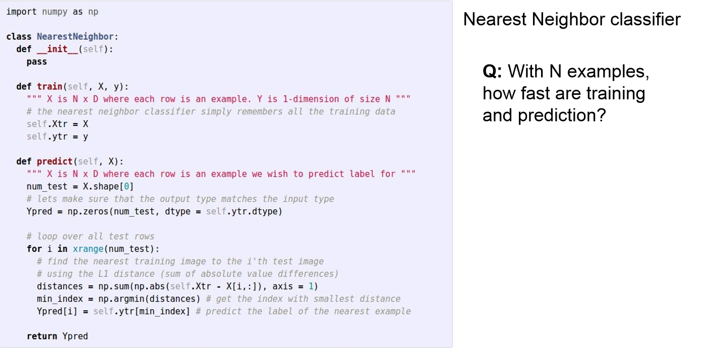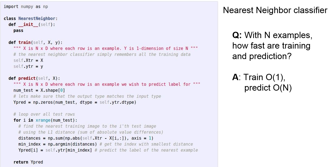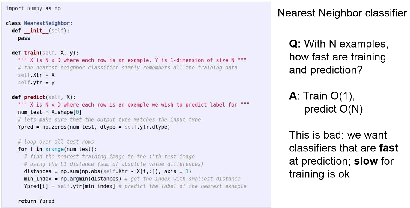 Nearest Neighbor 방식은 Predict 할때의 과정이 많은 시간을 요구하고 사진과 사진사이의 distance 는 사실상 그렇게 중요한 값이 아니기 떄문입니다.