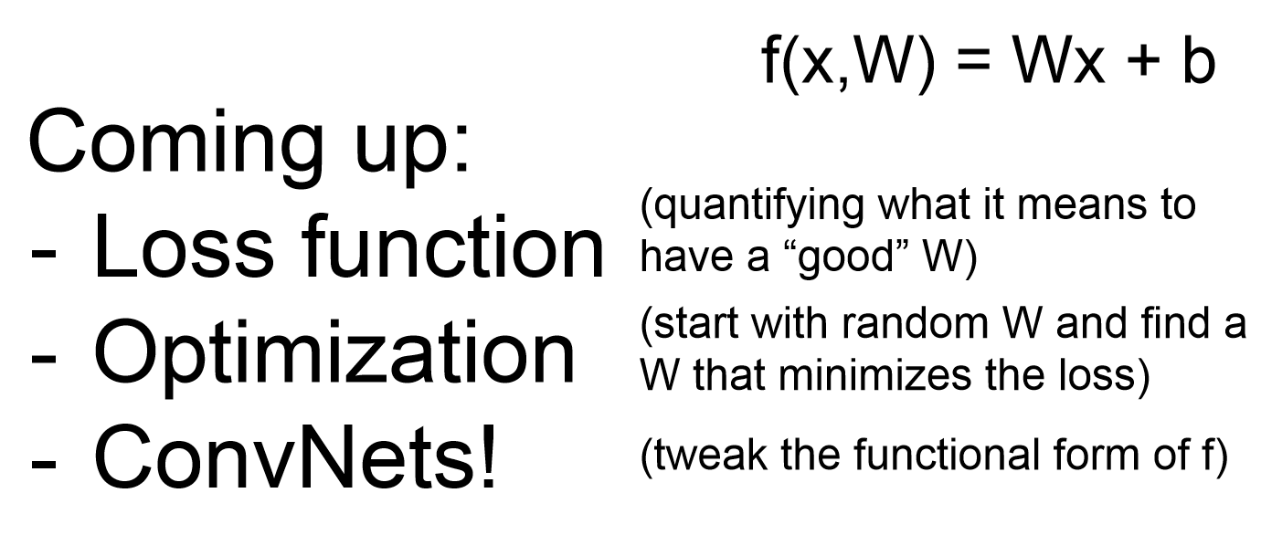 실제로 w는 기울기 값을 나타내며 b는 y절편을 나타내므로 많은 사진들이 있는 점들 중에서 최대한 많은 정답을 직선 한쪽으로 몰아넣을 수 있는 w,b값을 정하는 것으로 Linear Classification의 훈련과정이 동작하게 되는 것입니다.