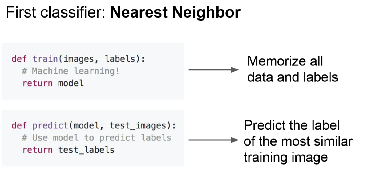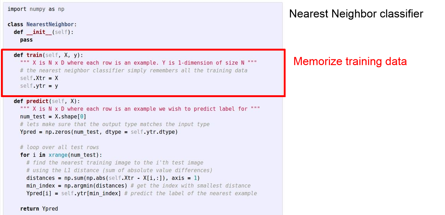 Nearest Neighbor classifier 에서 이미지 분류는 모든 이미지를 외운다음에 알려주는 것이라고 하였습니다.