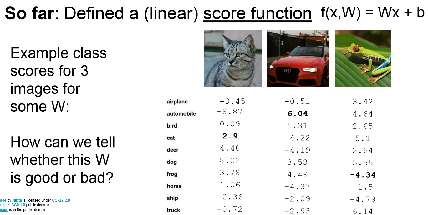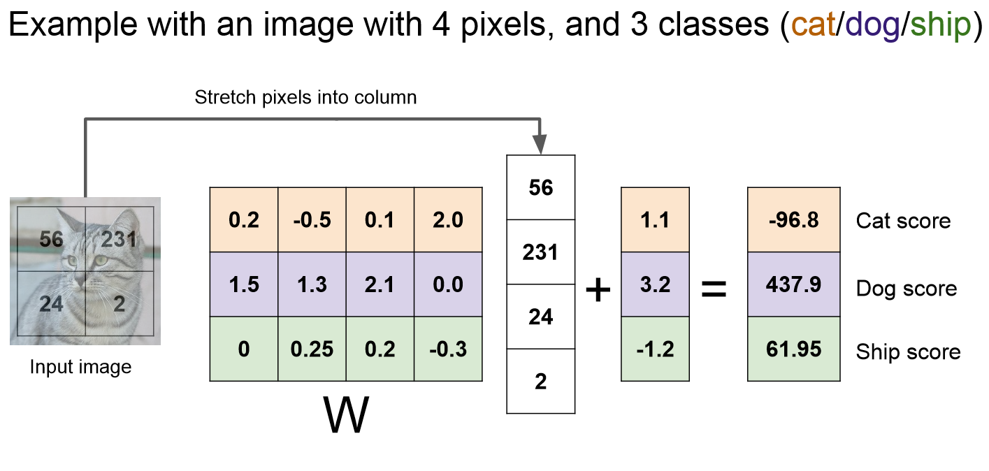 그 후에 고양이의 bias 값인 1을 더하면 결과적으로 -96.8이 나오고 이것이 바로 위 함수 f(x,W)에서의 고양이의 점수라고 할 수 있습니다.