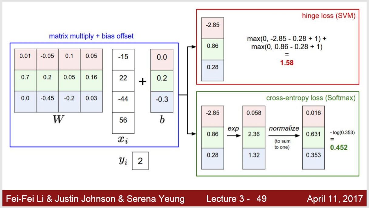 이렇게 score가 나오면 svm hinge loss 와 cross-entropy loss ( softmax ) 의 차이점을 볼 수 있습니다.